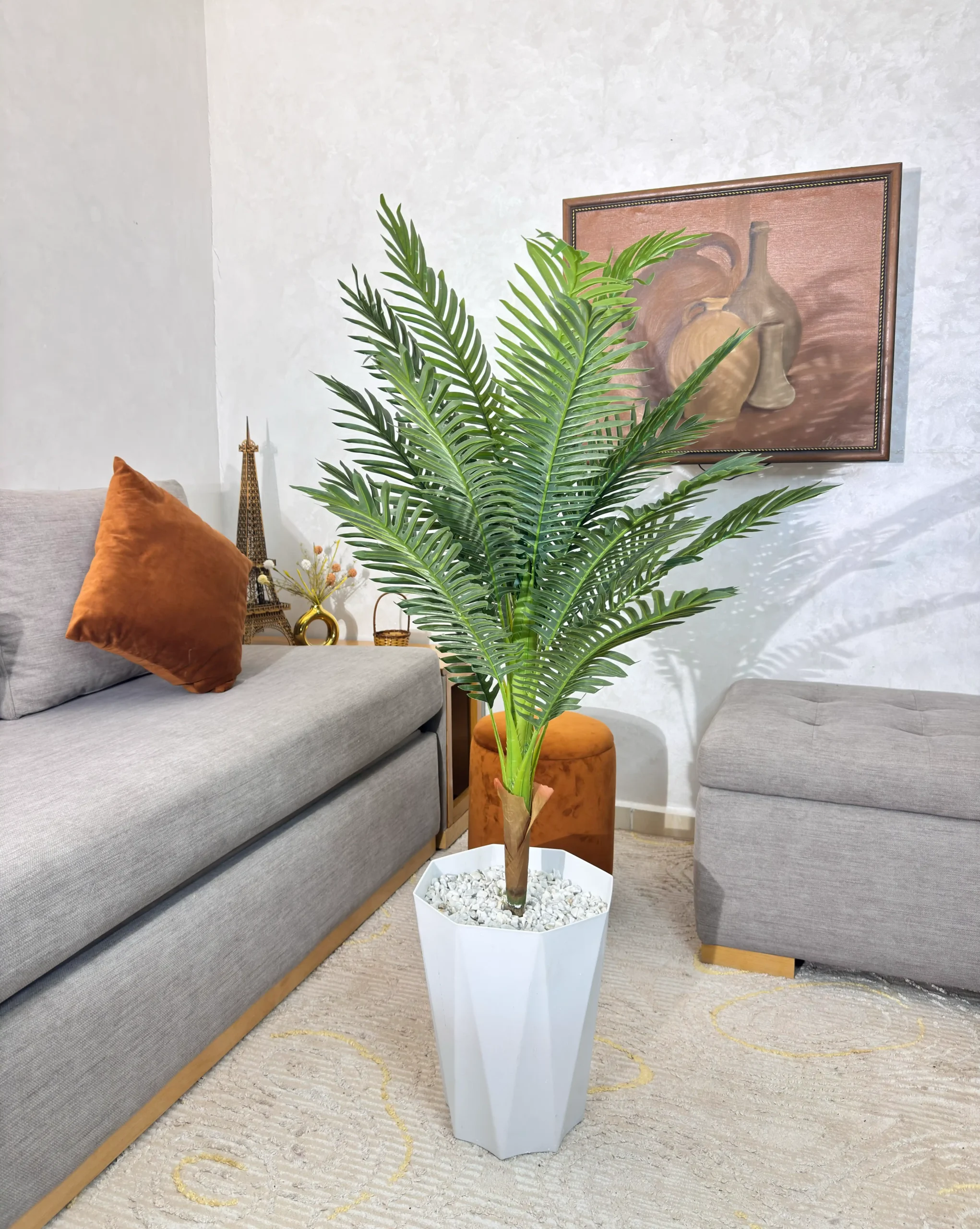« لمسة استوائية دائمة، في بيتك أو مكتبك » المواصفات الفنية:- الارتفاع : 1م20 سم – المادة: أوراق من السيليكون الناعم عالي الجودة + ساق من البلاستيك المعزّز (مقسى بالفيبر جلاس داخليً- التفاصيل: ورق مُقسم إلى شرائح طبيعية، أطراف مُحدّدة بدقة، لون أخضر متدرج (من فاتح إلى غامق) – وعاء متوفر ب : 3 الوان🟡⚪⚫ سيراميكي مُزخرف (أو خشب/معادن حسب الموديل) + رمل زخرفي أبيض – المميزات: لا يحتاج رعاية — لا ري، مقاوم للغبار، الأشعة UV (للاستخدام اخل المباني وخارجها المظلل) آمن للأطفال والحيوانات سهل التنظيف (مسح بقطعة قماش جافة أو رطبة)🎯 الاستخدامات الموصى بها: 🏚مداخل المنازل والفلا -استقبال الفنادق والمكاتب ديكور المولات والمطاعم تصوير المنتجات والإعلانات (لأنه لا يذبل تحت الإضاءة) 🎁هدايا مؤسسية أو مناسبات خاصة (زفاف، افتتاح)