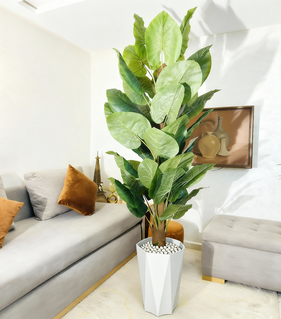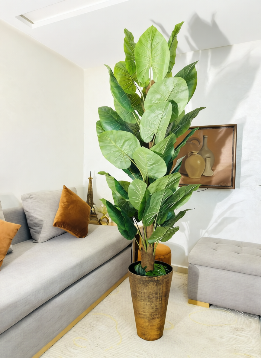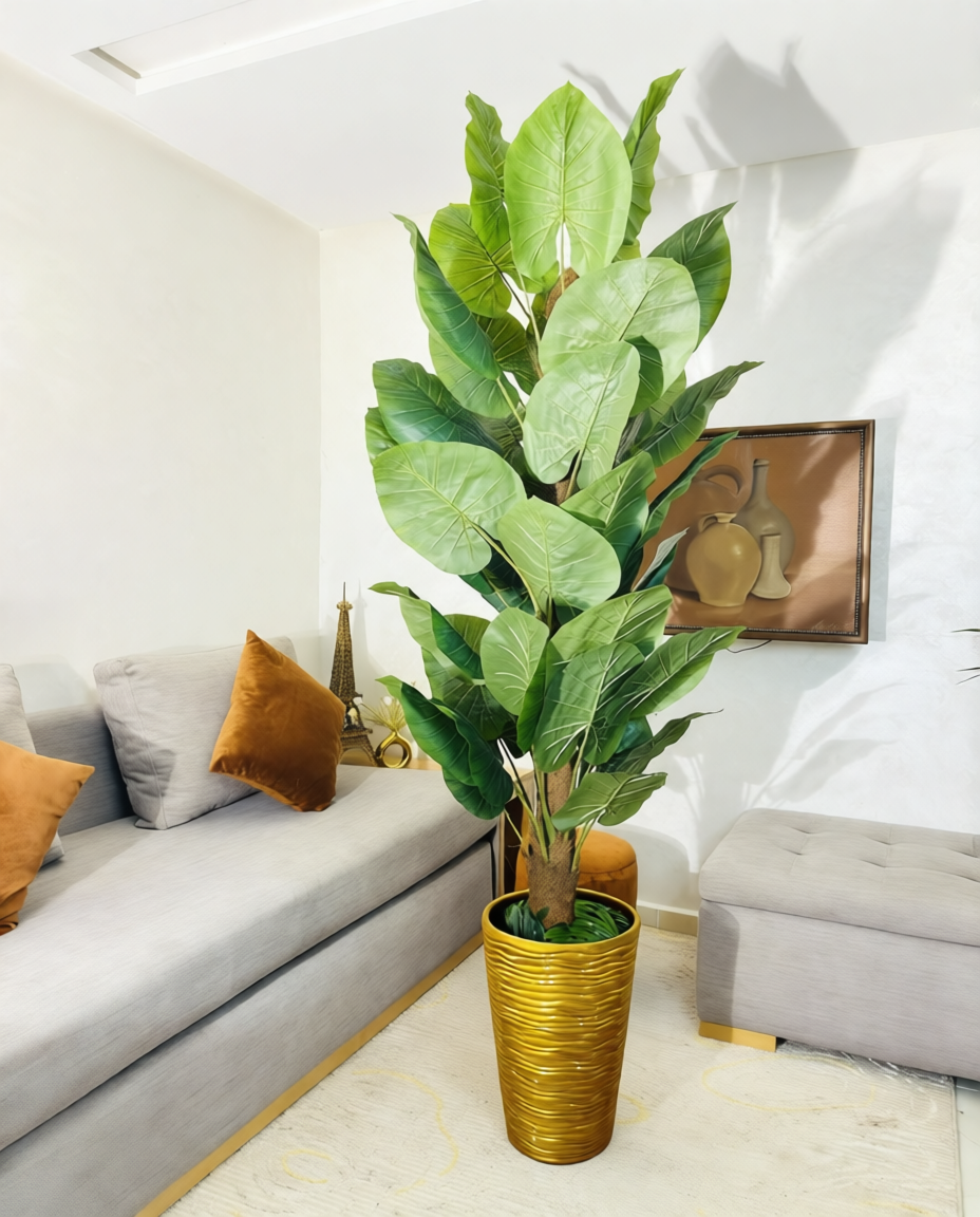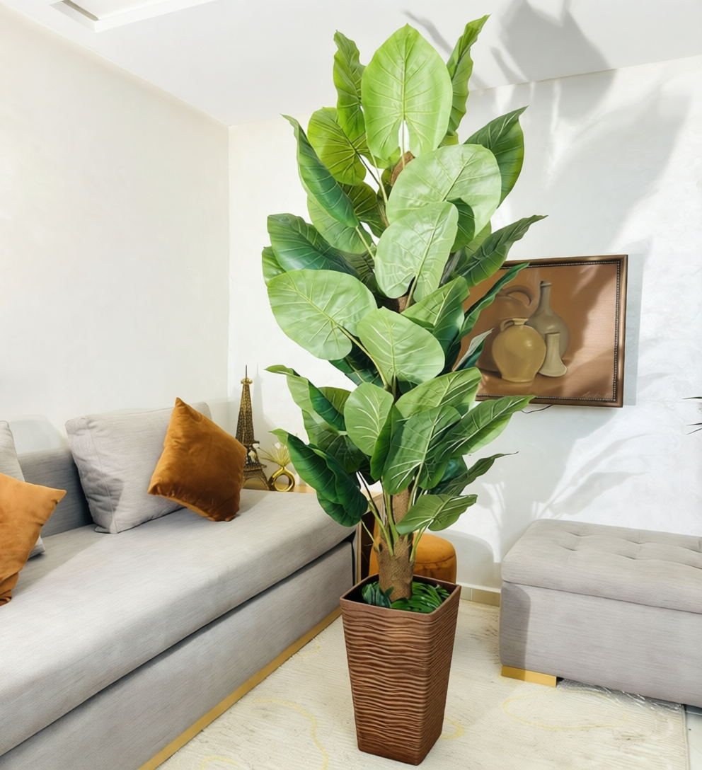حيث تلتقي الطبيعة بالرقي الحديث »إجعل منزلك يتنفس جمالًا استوائيًّا مع شجرة الكولوكاسيا الفاخرة. بأوراقها الضخمة القلبية، بحجم يصل إلى 60 سم، تُضفي لمسة درامية وحيوية على أي ديكور منزلك او مقر عملك مواصفات تقنية مميزة؛ الأوراق : مصنوعة من البوليمر عالي الجودة (PVC/PU) مع طباعة دقيقة للعروق وتأثير لمعان طبيعي.-الساق: هيكل داخلي من الألياف الزجاجية مع غلاف خارجي من الليف الطبيعي (أو محاكاة واقعية)، يضمن الاستقرار والمتانة.-الوعاء**: من إختيارك – إرتفاع الشجرة الإجمالي: .2م25سم–2م00 سم). الصيانة : لا تحتاج ريًّا، ولا ضوء شمسي، ولا تقليم فقط مسح خفيف بالقطن كل شهر.- الاستخدام : مناسبة للمنرل الفيلا مقر العمل للداخل والخارج (غير معرضة للمطر المباشر). 🎯 لماذا تختارها؟ لأنها ليست مجرد نبات — بل قطعة فنية ثلاثية الأبعاد تُعيد تعريف الفراغات. تُضيء زوايا الغرفة بظلها الناعم، وتخلق إحساسًا بالهدوء والاسترخاء، كما لو كنت في جنة استوائية خاصة بك.