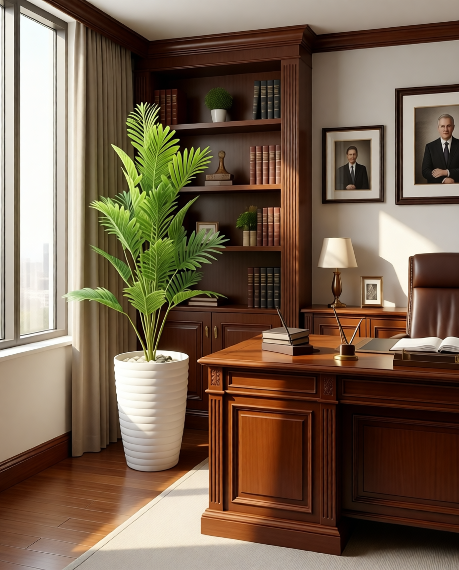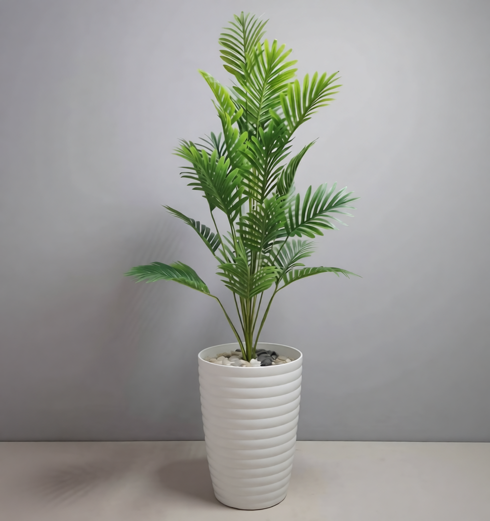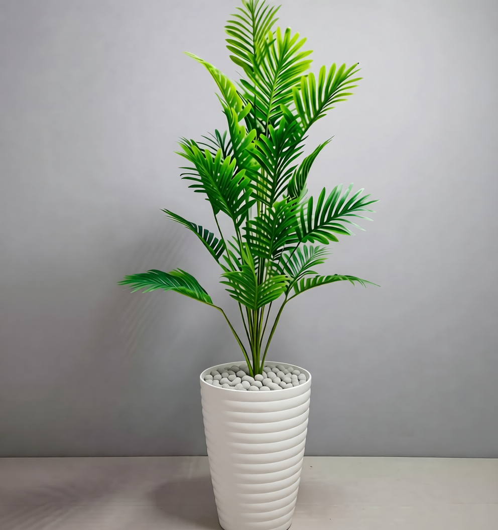 ديكور استوائي بلا عناء ، أضف لمسة طبيعية فاخرة إلى صالة عصرية أو مكتب أنيق — دون ريّ، دون ضوء شمس، ودون صيانة.نخلتنا الاصطناعية بارتفاع : 140 سم / تجمع بين واقعية الأوراق ومتانة التصميم، لتبقى خضراء زاهية طوال العام. …..ماذا تختارها – أوراق من بوليستر عالي الجودة بلون أخضر فاقع – ساق مغطاة بليف طبيعي يدوي الصنع – تناسب الوعاء الأبيض الناصع (مشمولة) – لا تتطلب عناية — فقط مسح خفيف عند الحاجة – مثالية للديكورات الداخلية العصرية ( منزل، مكتب مقر العمل فيلا فندق مقعى « الجمال الطبيعي… بدون تعقيد. »🛒 **جاهزة للشحن اليوم— غيّر فضاءك في دقائق!